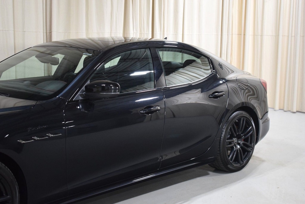 2022 Maserati Ghibli Modena Q4 in Nero Ribelle exterior with Rosso and Nero interior. The Maserati Ghibli Modena features a 3.0L Twin-Turbo V6 Engine with 424hp.